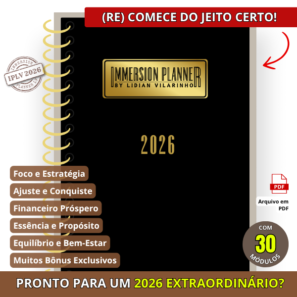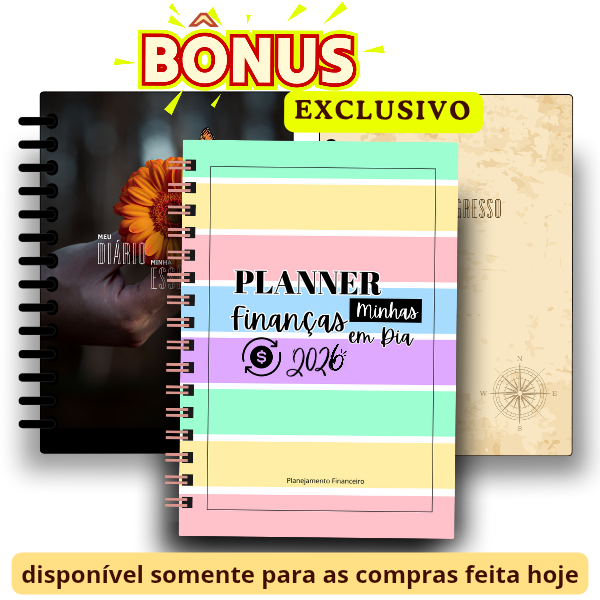 Comprando AGORA, além de garantir o preço de lançamento do Immersion Planner 2026, você ainda leva de brinde os arquivos do Planner Minhas Finanças em Dia 2026 – Cores Pastel, Meu Diário de Progresso e Meu Diário Minhas Essência.